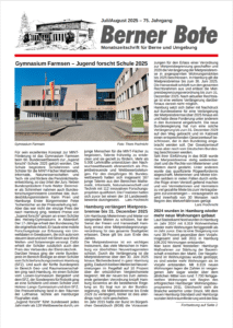 Themen (u.a.): Gymnasium Farmsen – Jugend forscht Schule 2025 | Hamburg verlängert Mietpreisbremse bis 31. Dezember 2025 | 2024 wurden in Hamburg wieder mehr neue Wohnungen gebaut | ZIA-Verband zeichnet Hamburgs Bauordnung in der Kategorie „Beschleunigtes Bauen“ aus | Jahresbericht 2024 der Feuerwehr Hamburg vorgestellt | Sozialbehörde veröffentlicht Neukonzeption der Straßensozialarbeit | Keine Skandalisierung von Steilshoop | Gewerbeflächenkonzept aktualisieren | Benennung einer Straße in Wandsbek zu Ehren von Margot Friedländer | Das stand im Berner Boten vor 50 Jahren: Modell-Heim für Behinderte in Berne | Veranstaltungen und SPD-Mitteilungen